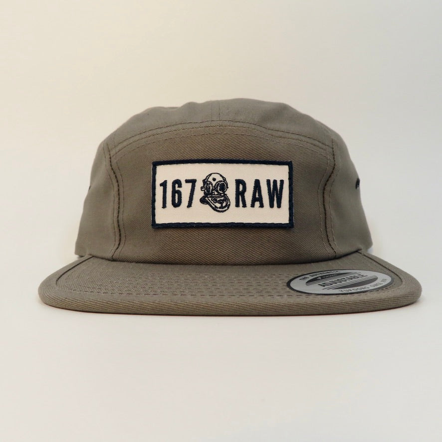 5 PANEL HAT IN NAVY BLUE, BLACK, OR KHAKI WITH STRAP BACK FASTENING. PATCH OF 167 RAW LOGO.